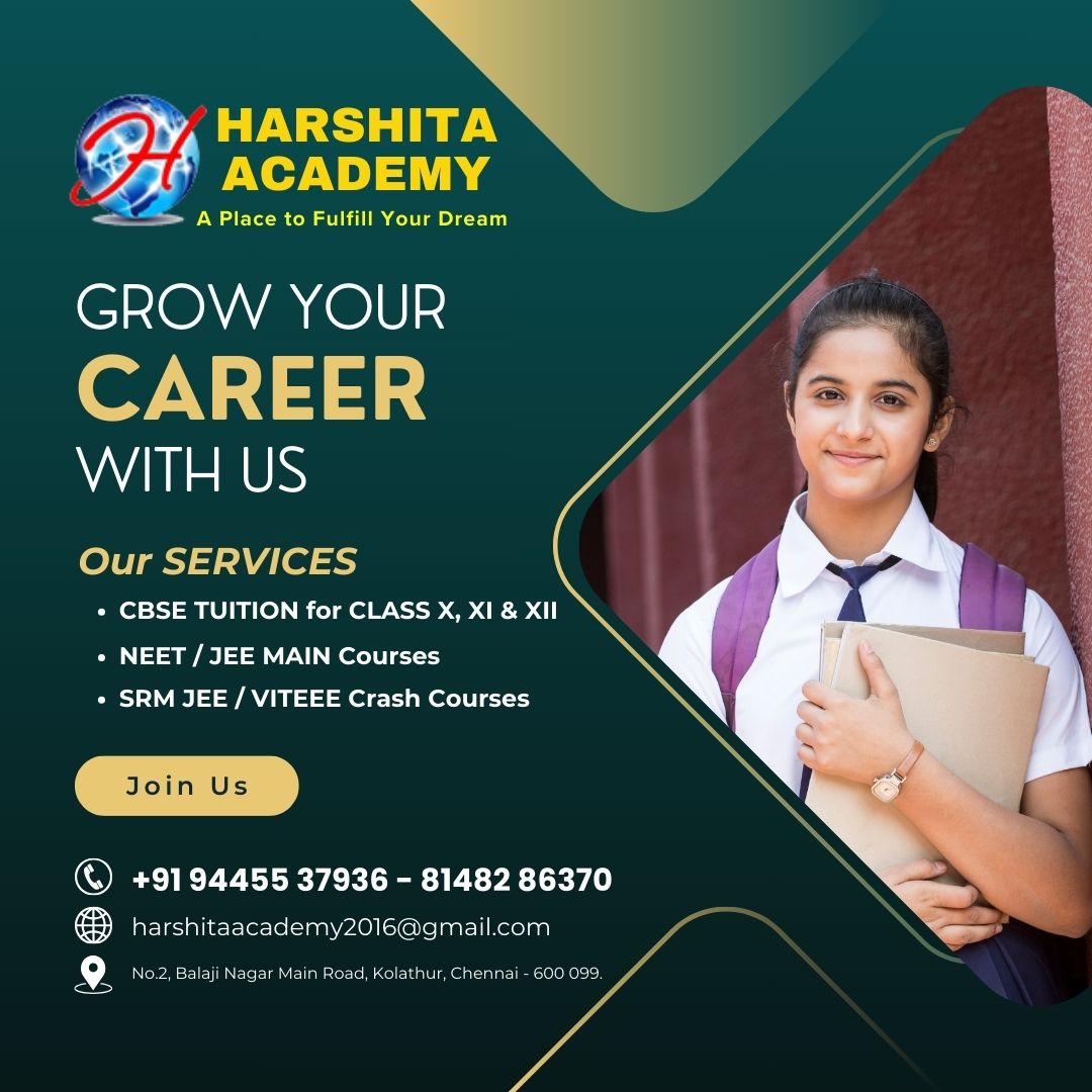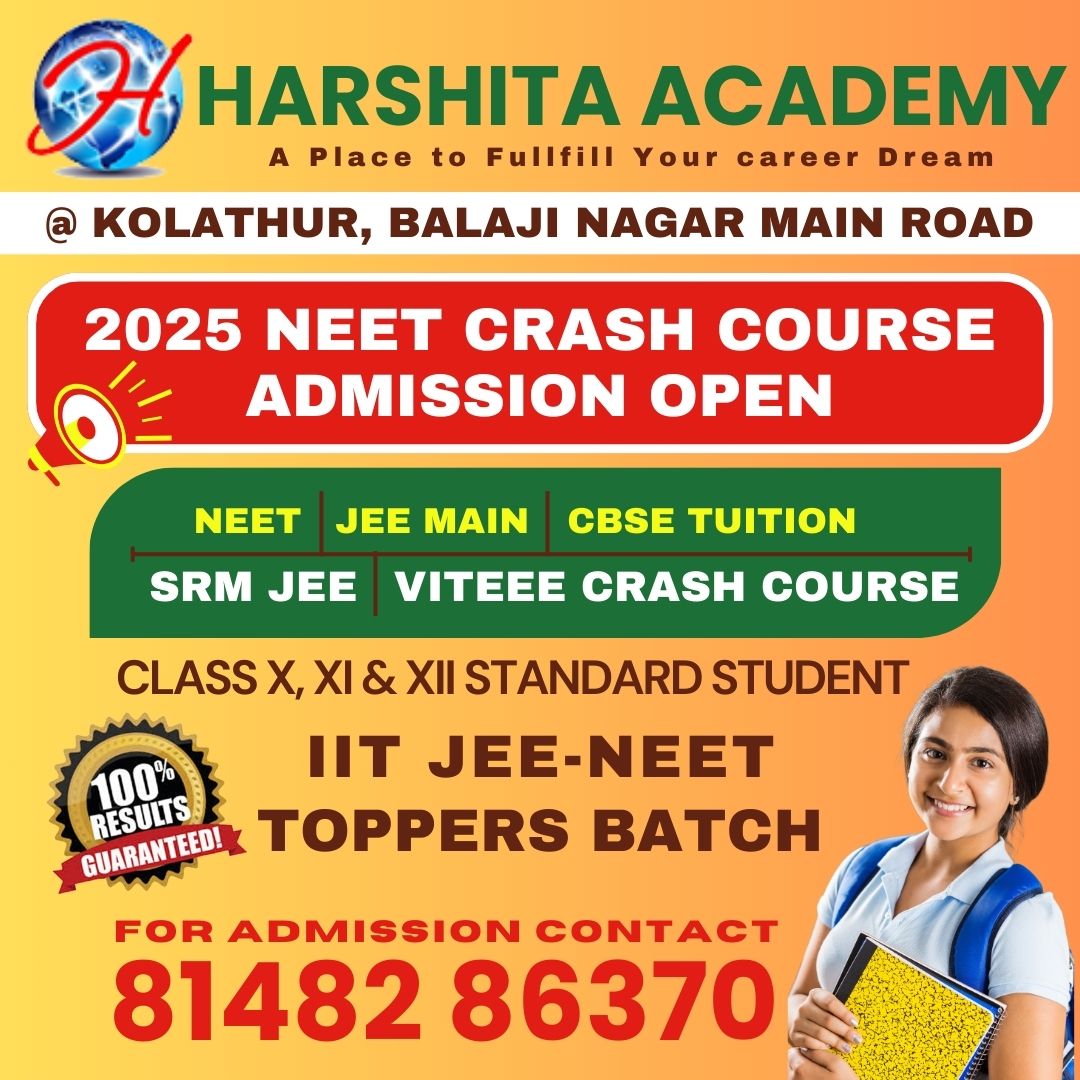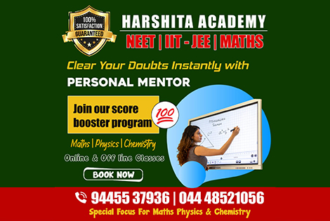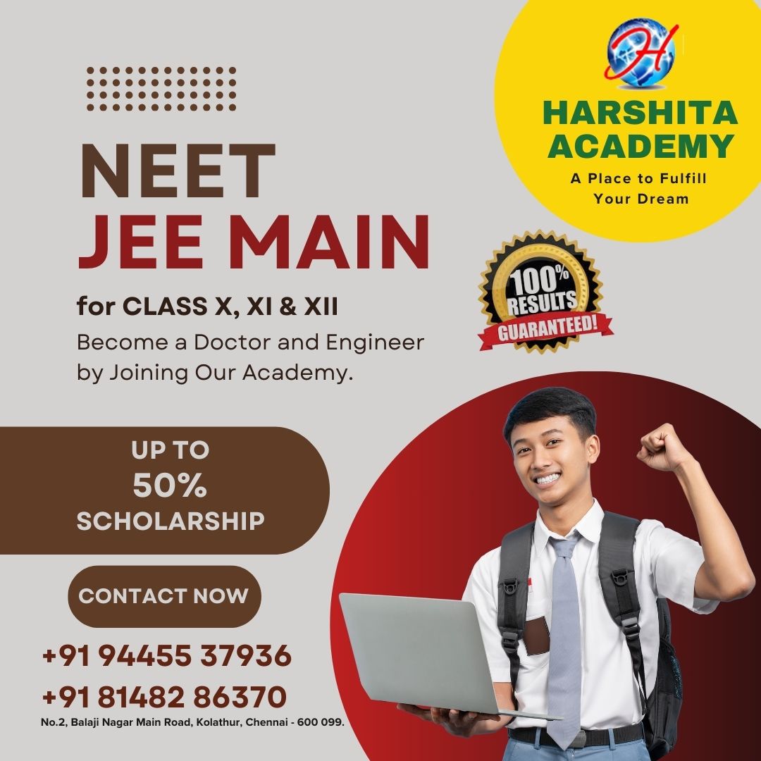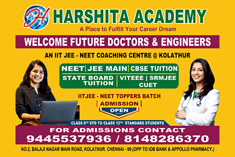 Harshita Academy an Entrance Exam Coaching Centre in Chennai for NEET, AIIMS, JIPMER, IIT JEE Main & JEE Advanced, CLAT, CA CPT, IMUCET & other Competitive Exams in India.Harshita has Experienced faculties & Our Academic Director Proff Rajkumar ( An IIT Alumni) was Ex Professor in IIT Madras, We Assure 100% Results through our dedicated faculty team for each and Every Course & Shall provide Individual attention to Students by our Subject Experts to provide depth Knowledge.
