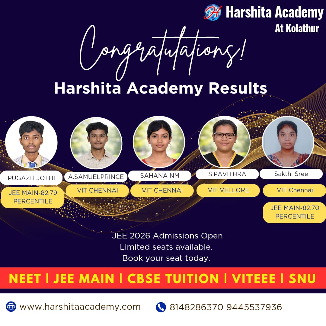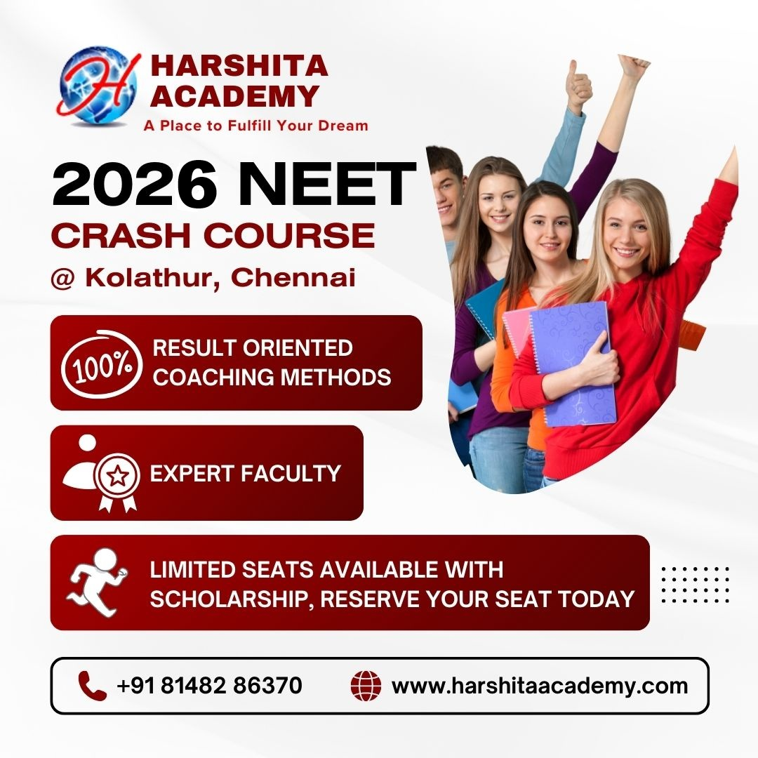 Harshita Academy an Entrance Exam Coaching Centre in Chennai for NEET, AIIMS, JIPMER, IIT JEE Main & JEE Advanced, CLAT, CA CPT, IMUCET & other Competitive Exams in India.Harshita has Experienced faculties & Our Academic Director Proff Rajkumar ( An IIT Alumni) was Ex Professor in IIT Madras, We Assure 100% Results through our dedicated faculty team for each and Every Course & Shall provide Individual attention to Students by our Subject Experts to provide depth Knowledge.